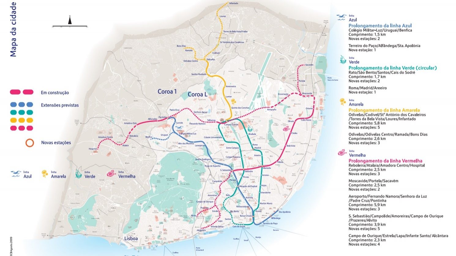 Entre 2017 e 2025, prevê-se a construção das estações de Algés, Belém, Ajuda, Santo Amaro, Alcântara-Terra, Campo de Ourique, Amoreiras, Campolide (continuação da linha vermelha, que entronca com a linha azul em São Sebastião), Benfica, Uruguai, Padre Cruz, Senhora da Luz e Fernando Namora (através de uma ligação de Telheiras à linha azul). Posteriormente, e até 2030, o plano prevê acrescentar à linha vermelha as estações de Alvito e Prazeres, e à linha amarela, e já no vizinho concelhos de Loures, as estações de Santo António dos Cavaleiros, Frielas e Loures, e uma extensão da linha vermelha a partir de Moscavide para criar as estações de Portela e de Sacavém, também no concelho de Loures.