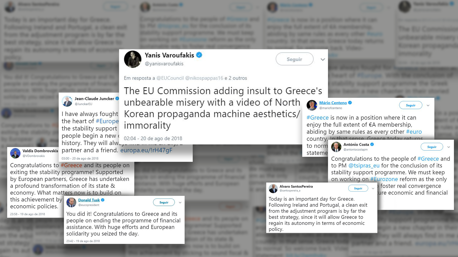 O comentário de Yanis Varoufakis surgiu pouco depois de a Comissão Europeia ter partilhado um vídeo, onde o presidente do Eurogrupo e também ministro das Finanças português, Mário Centeno, anuncia o fim do calvário grego.