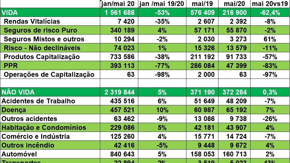 Foi o primeiro período, maio 2020 comparando com maio 2019, em que realmente se constataram os efeitos do confinamento. Para além dos ramos acidentes de trabalho e automóvel que em conjunto significaram menos 40 milhões de euros de custos com sinistros, também se verificaram baixas de sinistralidade em multirriscos/incêndios empresariais (menos 65%), em transportes (-67%), em multirriscos habitação (-21%). No conjunto os ramos não Vida registaram menos 18,5% de valor de custos com sinistros neste mês.