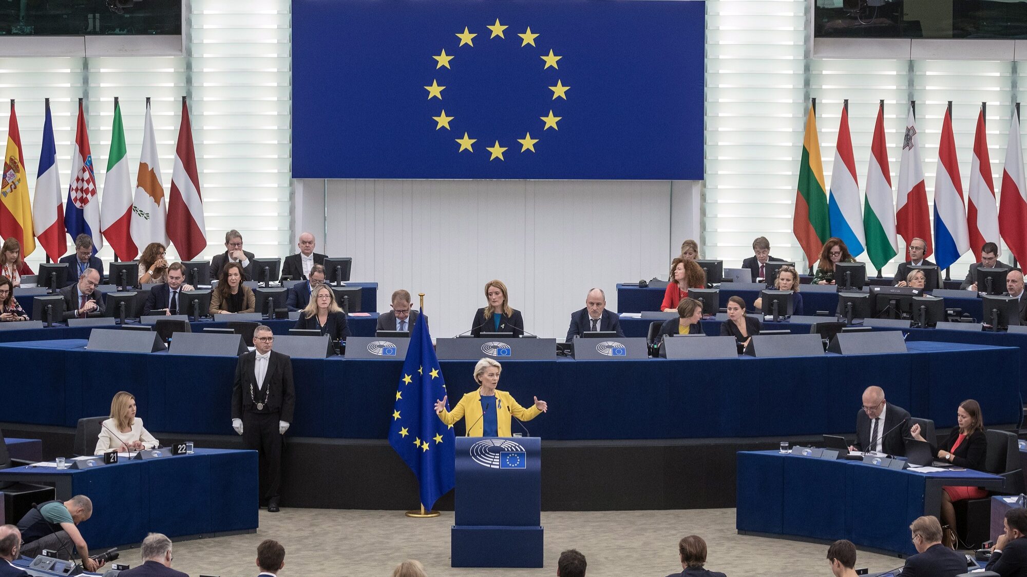 Sob o mote de que a invasão russa da Ucrânia “é uma guerra à nossa energia, à nossa economia, aos nossos valores e uma guerra ao nosso futuro”, e com a primeira dama ucraniana sentada na plateia como convidada de honra, von der Leyen enumerou uma série de promessas para os próximos 12 meses.