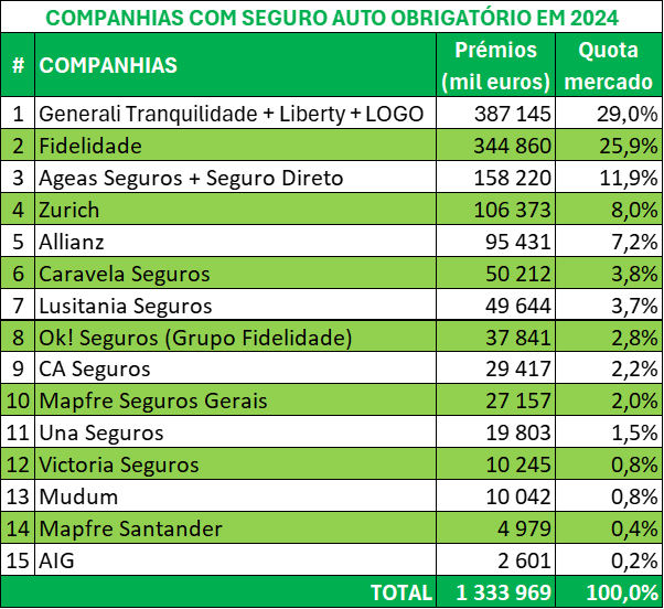 Neste segmento de negócio sofreram diretamente 15 companhias ativas em 2024, mas este ramo está muito concentrado em poucas: As 5 maiores, com as suas várias marcas fazem 80% dos seguros e as 10 maiores mais de 96%. Com a integração da Liberty, a Generali tornou-se líder neste segmento, seguindo-se a Fidelidade, em cujo grupo se integra a Ok! Seguros que, no entanto, é uma companhia autónoma, a Ageas e o seu canal Seguro Directo, as internacionais Zurich e Allianz, enquanto a Caravela lidera o grupo das três seguradoras nacionais que ainda inclui a Lusitania e a CA Seguros