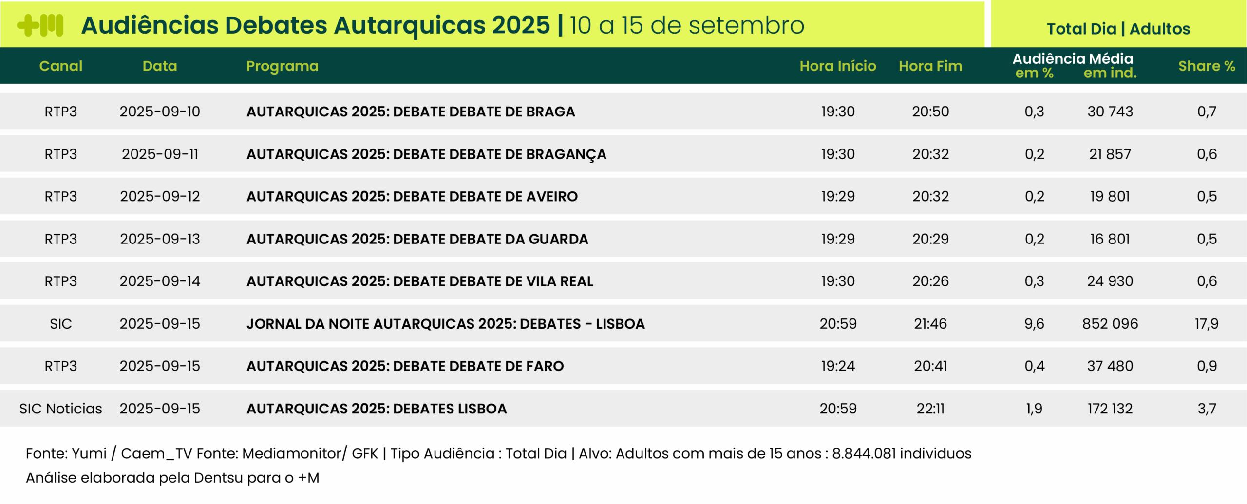 De acordo com a análise da Dentsu Media para o +M, os 47 minutos de debate transmitidos na SIC foram acompanhados em média por 852 mil telespectadores, número que traduz uma audiência média de 9,6%.
