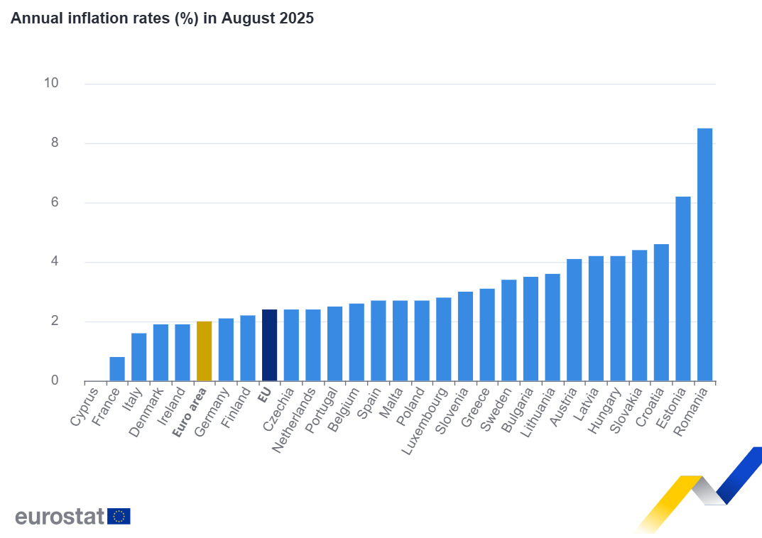 A taxa de inflação homóloga na Zona Euro manteve-se estável em 2% em agosto, abaixo da estimativa inicial de 2,1% apontada pelo Eurostat no início deste mês.