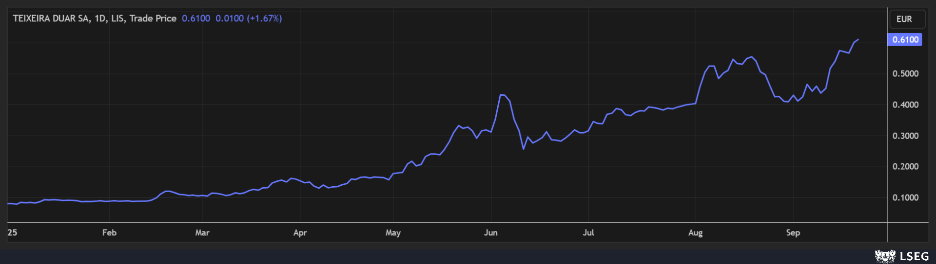 As ações da Teixeira Duarte disparam uns estonteantes 672,15%, desde o início do ano, com a empresa a beneficiar com as melhores perspetivas para a empresa, depois de ter fechado um acordo para reestruturar a dívida com a banca e ter aumentado o lucro para 42,4 milhões no primeiro semestre, tendo conseguido arrecadar 440 milhões para a carteira de encomendas com a sua participação no consórcio que ganhou o primeiro troço da Alta Velocidade.