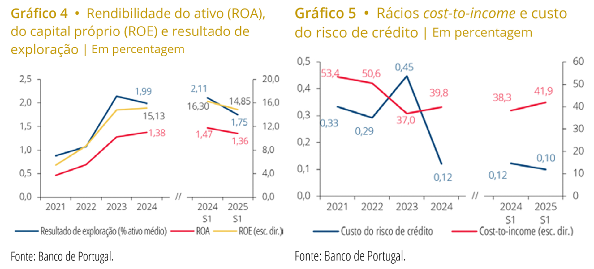 Paralelamente, o rácio cost-to-income — que mede a eficiência operacional dos bancos — deteriorou-se para 41,9%, mais 3,6 pontos percentuais do que no primeiro semestre de 2024. Este agravamento reflete tanto “a redução do produto bancário no denominador (contributo de +1,6 pontos percentuais) e o aumento dos custos operacionais (contributo de +2 pontos percentuais), com destaque para os custos com pessoal e despesas com tecnologias de informação”.
