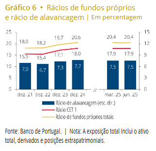 No capítulo da solvabilidade, os bancos continuam a exibir rácios de capital robustos. “No 2.º trimestre de 2025, os rácios de fundos próprios totais e de fundos próprios principais de nível 1 (CET 1) mantiveram-se em 20,4% e 17,9%, respetivamente”, refere o banco de Banco de Portugal. Estes valores permanecem significativamente acima dos mínimos regulamentares, proporcionando uma almofada confortável para enfrentar eventuais choques.