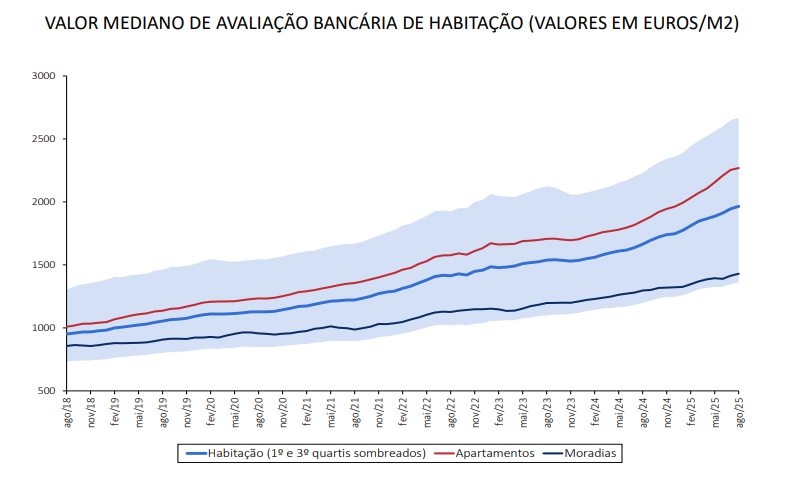 No que diz respeito às moradias, o valor mediano da avaliação bancária subiu 10,3% em termos homólogos, para 1.430 euros por metro quadrado em agosto de 2025. Mais uma vez, os valores mais elevados observaram-se na Grande Lisboa (2.705 euros por metro quadrado), seguidos pelo Algarve (2.479 euros por metro quadrado), registando o Centro e o Alentejo os valores mais