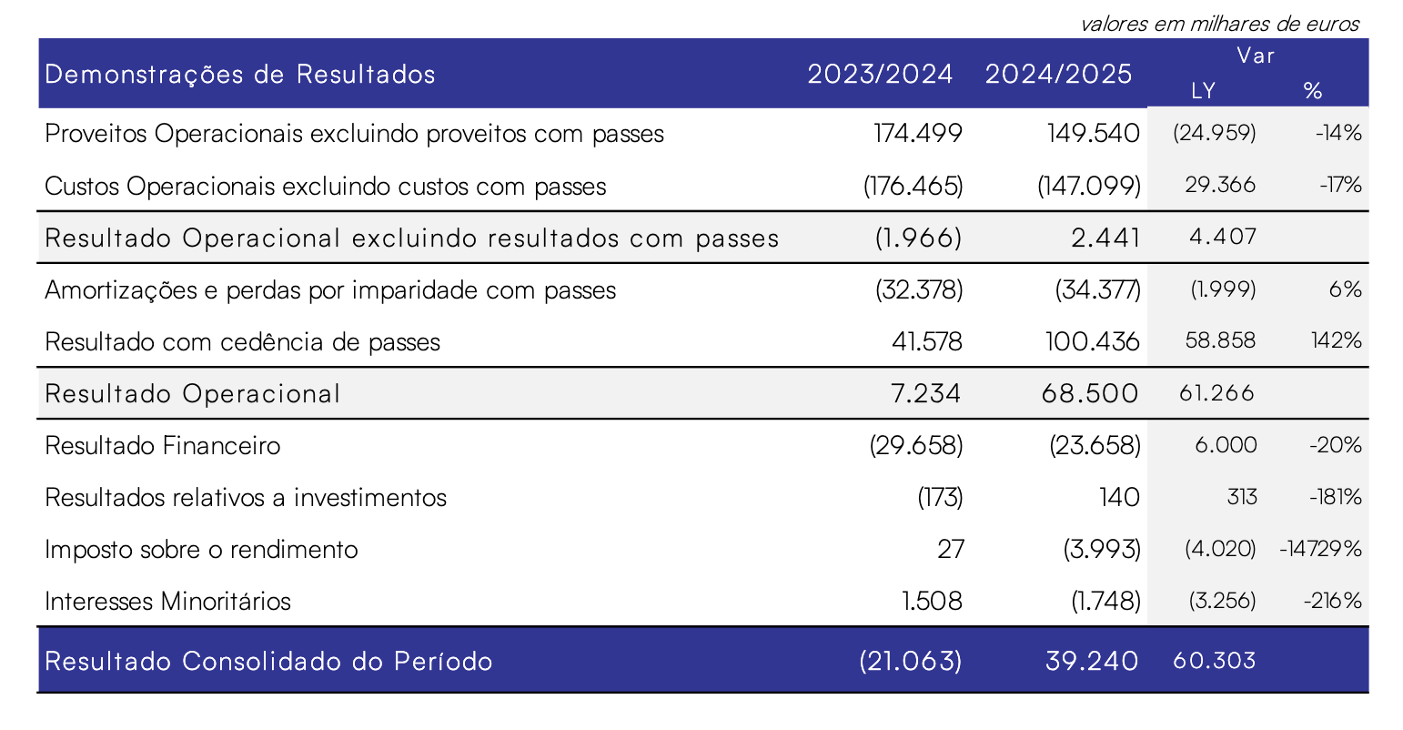 Destaque ainda para a melhoria de 20% no resultado financeiro, que se cifrou em 23,7 milhões negativos, contra 29,7 milhões negativos no exercício 3023/2025.