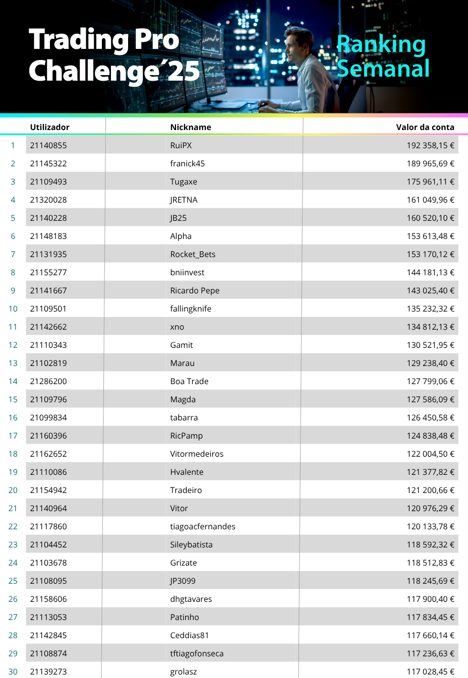 Desta vez, o vencedor da semana — com o nickname RuiPX — destacou-se entre as centenas de participantes que estão a testar as suas estratégias na plataforma Trading Pro.