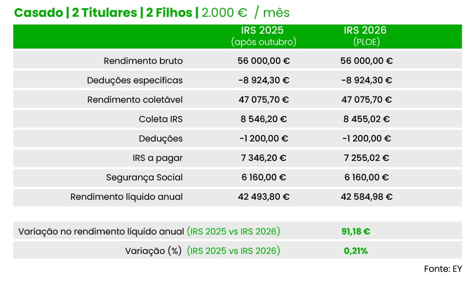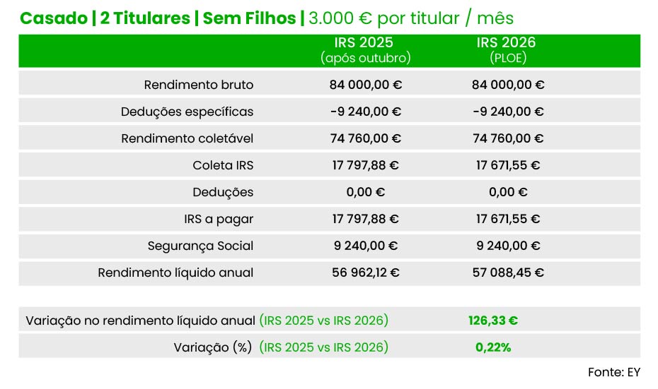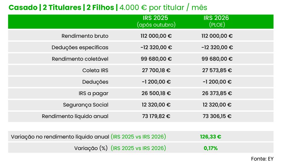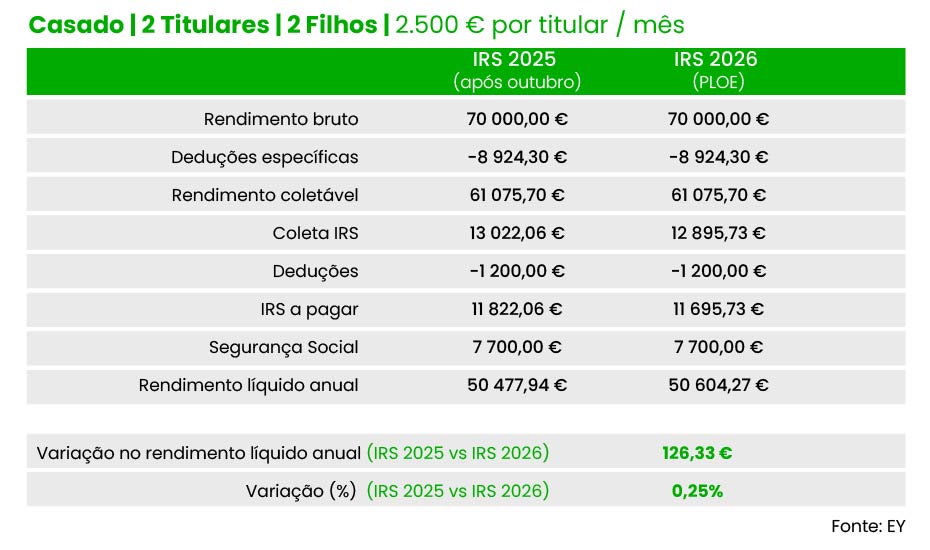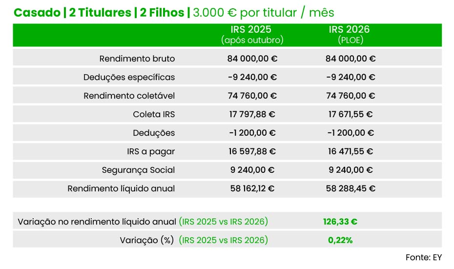 Do mesmo modo, um casal (dois titulares), com dois filhos e três mil euros de salário por titular pode contar com uma redução de 126,3 euros do IRS a pagar (63,17 euros por titular), no conjunto do ano. Valor idêntico é registado para casais com quatro e cinco mil euros de salário por cada titular, de acordo com as contas da EY.
