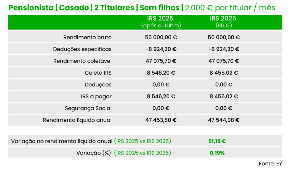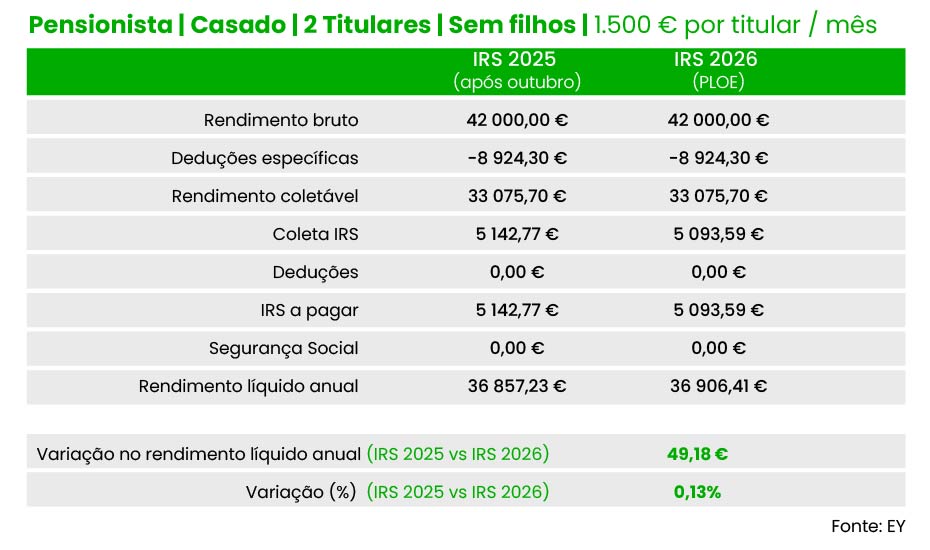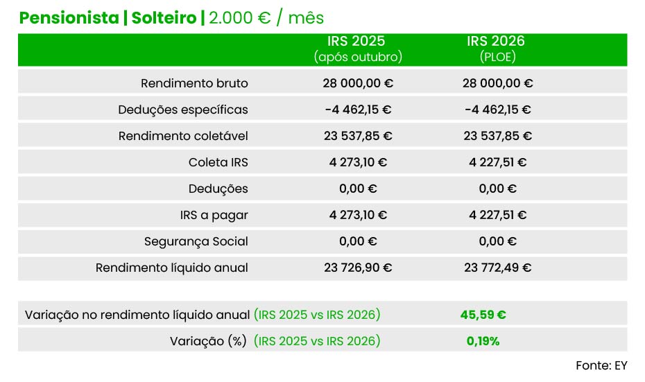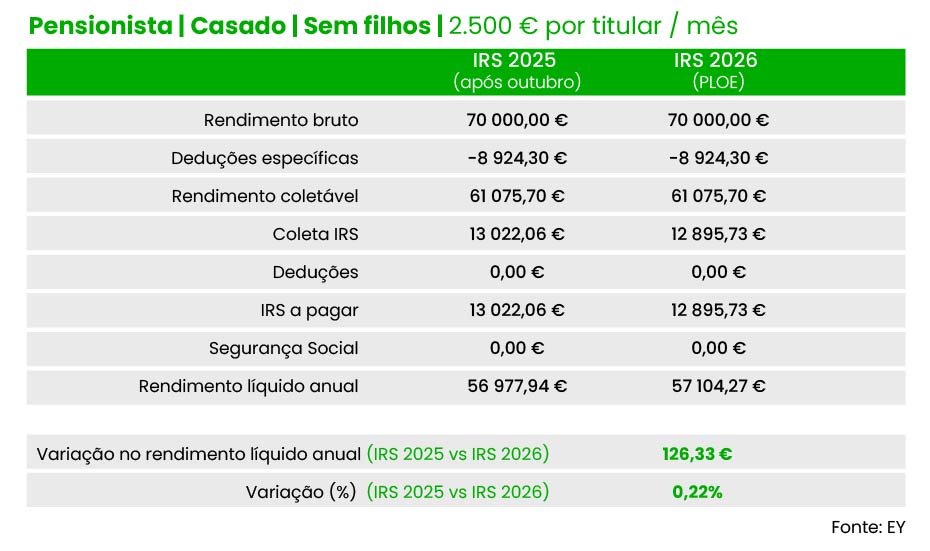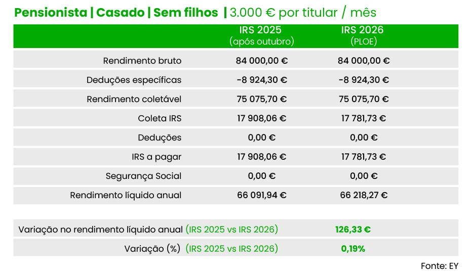 Por exemplo, um pensionista solteiro com uma reforma mensal bruta de dois mil euros terá um “ganho” líquido de 45,59 euros em 2026, face às taxas de IRS hoje em vigor. E um casal de pensionistas (dois titulares) com quatro mil euros de reforma por titular podem contar com um alívio total de 126,3 euros (63,17 euros por titular).