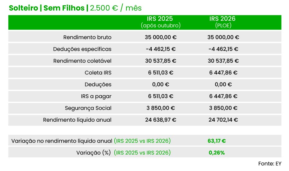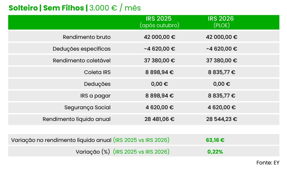 Vamos, então, aos casos práticos. Um solteiro sem filhos e um salário bruto mensal de 1.500 euros terá a pagar 2.546,80 euros de IRS em 2026. Com as taxas e escalões hoje em vigor, a fatura anual está em 2.571,38 euros no conjunto do ano, o que significa que, no próximo ano, a poupança total será de 24,59 euros.