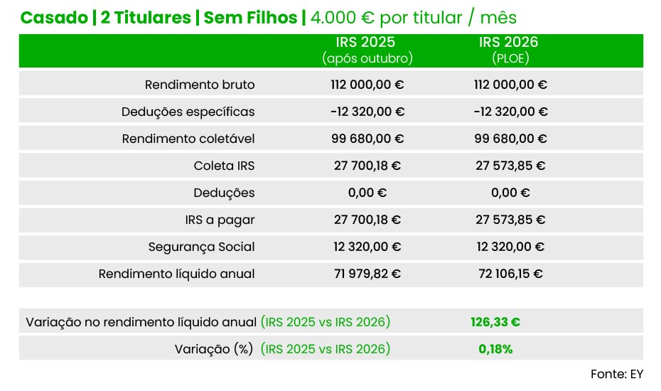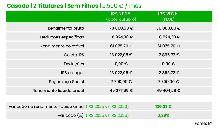 Vamos agora aos casados. No caso de um agregado com dois titulares, sem filhos e com 2.500 euros de salário por titular, a poupança total esperada para 2026 é de 126,3 euros (ou seja, 63,17 por titular), face às taxas de IRS hoje em vigor. Se não tivesse havido a redução que aconteceu no verão, o “ganho” no rendimento líquido seria de 407,49 euros (cerca de 204 euros por titular).