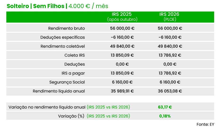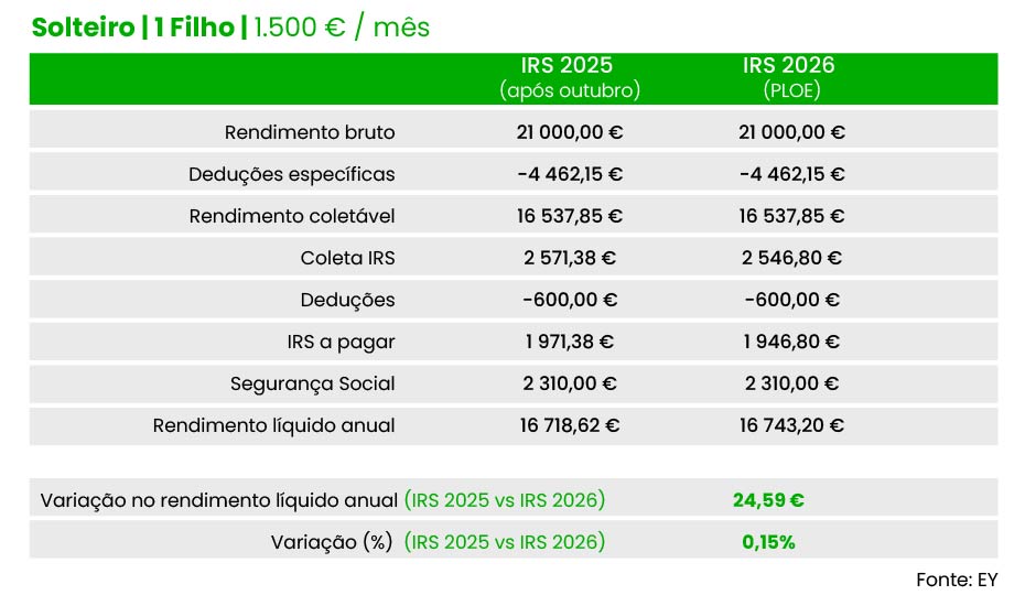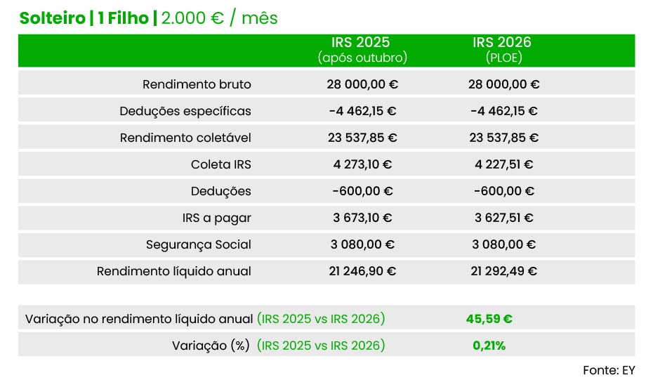 Já no caso de um solteiro com um filho e um salário bruto mensal de dois mil euros, a poupança estimada para 2026 é de 45,59 euros face às taxas hoje em vigor, calcula a EY. Em comparação com as taxas que vigoraram no início do ano, o “ganho” no rendimento líquido ultrapassa os 151 euros, indica a EY.