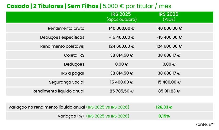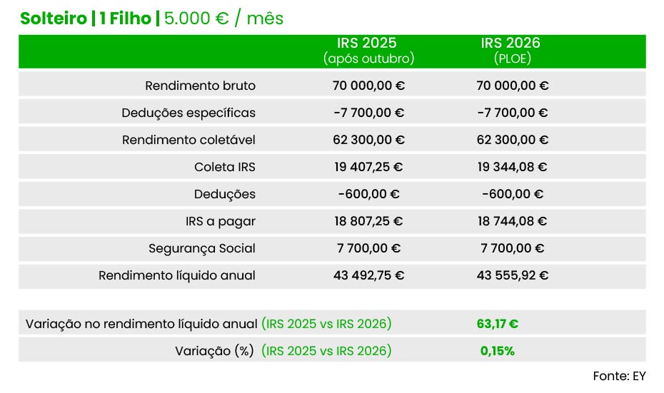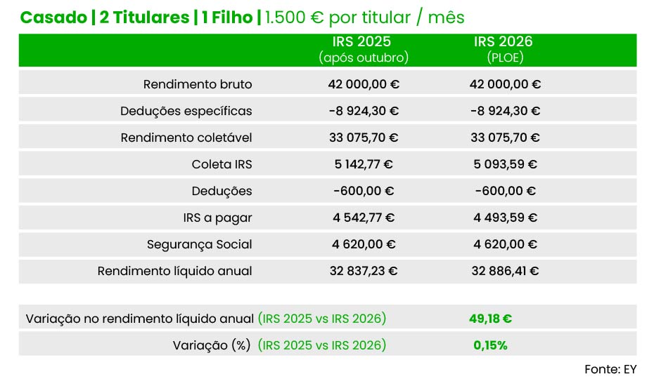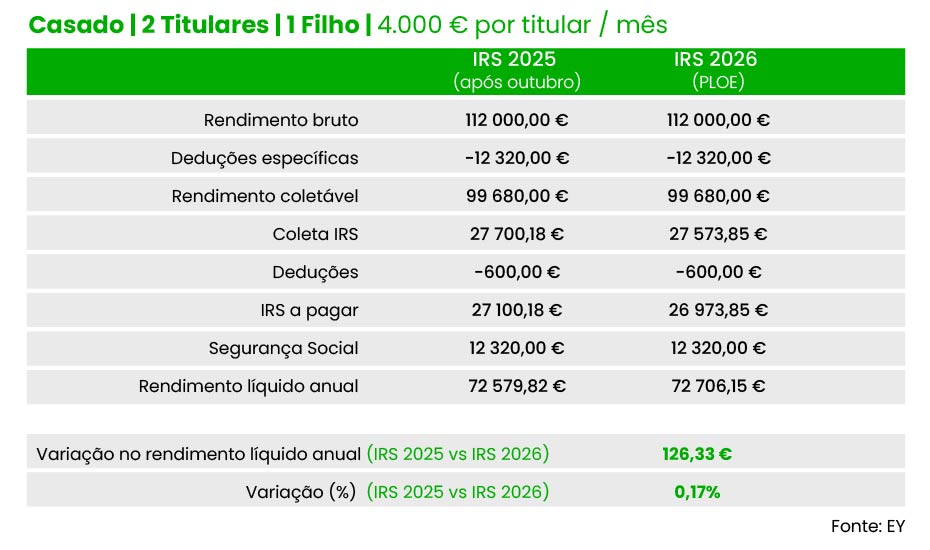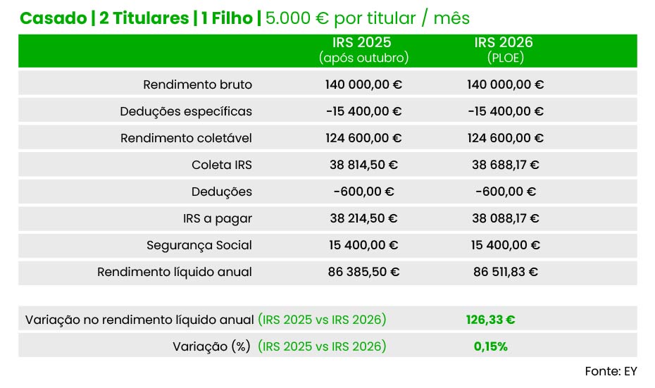 Também um casal (dois titulares), com um filho e cinco mil euros de salário por titular pode contar com poupança idêntica no próximo ano, de acordo com as contas da EY: 126,3 euros no total ou 63,17 por titular, face às taxas em vigor neste momento.