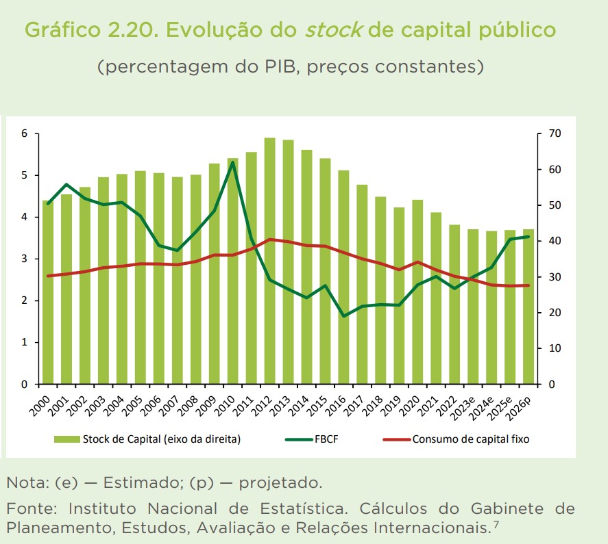 “Desde 2012 que o investimento tem sido sistematicamente inferior à depreciação do capital, o que significa que não tem sido suficiente para compensar a perda de valor dos ativos existentes”, lê-se na proposta do Orçamento. “Perante este cenário, o reforço do investimento público surge como condição necessária para inverter a tendência de depreciação do stock de capital público que se verifica desde 2014. A implementação do PRR deverá contribuir para este objetivo. As projeções para a evolução do stock de capital público em 2025 e 2026 obtidas com base no atual cenário macroeconómico implicam um aumento do peso deste no PIB em 2025 e 2026“, acrescenta a proposta.