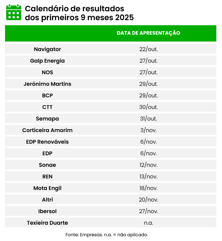 A fechar a semana mais intensa de resultados estão ainda os CTT, que apresentarão as contas a 30 de outubro (antecedendo o Capital Markets Day marcado para 4 de novembro), seguidos pela Semapa a 31 de outubro.