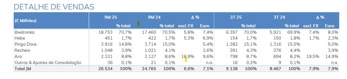 A Biedronka, líder no mercado polaco, continua a dar o maior contributo para as contas consolidadas da Jerónimo Martins. A marca da ‘joaninha’ voltou a registar um crescimento de vendas, em moeda local, de 5,8%. Em euros, as vendas atingiram 18,8 mil milhões, 7,4% acima dos primeiros nove meses do ano passado.