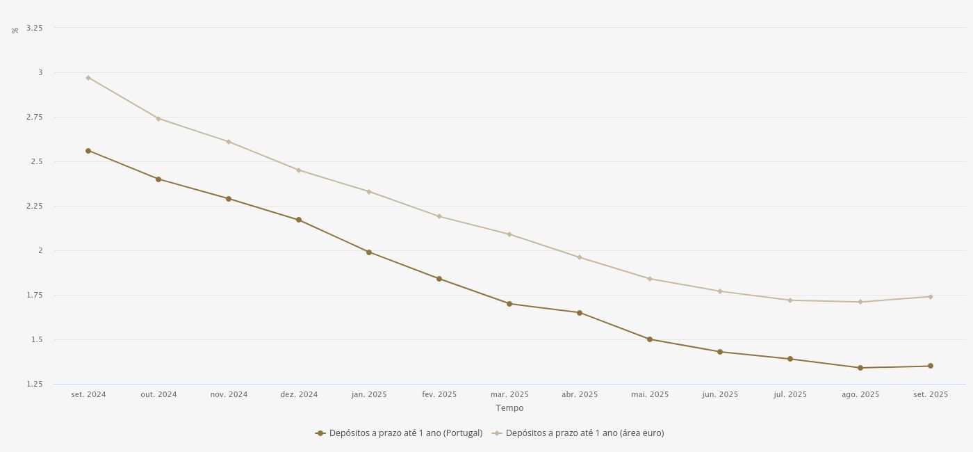 A remuneração atual dos depósitos a prazo pelos bancos portugueses é a mais baixa desde abril de 2023 (1,14%) e traduz uma quebra de 1,74 pontos percentuais desde dezembro de 2023, mês em que tinha atingido 3,08%, o valor mais elevado desde julho de 2012.