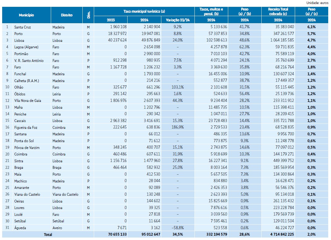 Em 2024 foram 31 os municípios que cobraram taxa turística, mais do dobro dos 15 concelhos que o faziam no ano anterior. Entretanto, juntaram-se em 2025 mais de uma dezena de outros concelhos, com receitas ainda não apuradas no Anuário agora divulgado pela OCC.