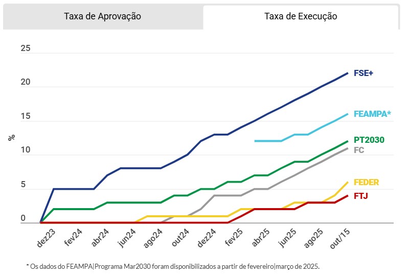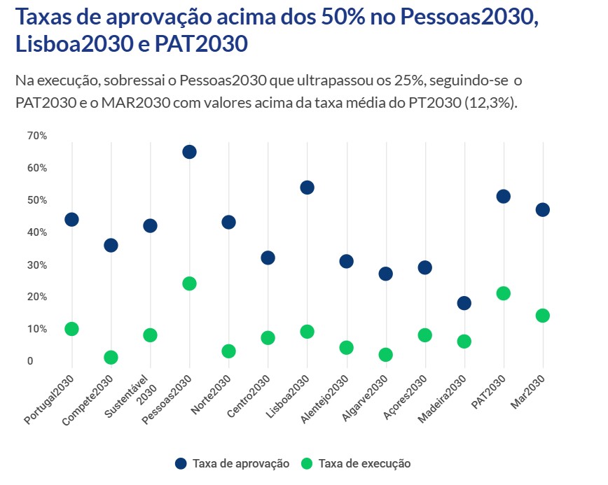 A taxa de execução do Portugal 2030 chegou aos 12,3% no final de outubro, mês em Portugal entregou a Bruxelas a proposta de reprogramação. De acordo com o boletim mensal do quadro comunitário de apoio, há 10,56 mil milhões de euros aprovados e 2,81 mil milhões executados até 31 de outubro. O Pessoas 2030 destaca-se com a maior taxa de execução (26,8%), sendo o único com mais de metade do fundo aprovado. O Compete continua a ter a taxa de execução mais baixa (3,4%).