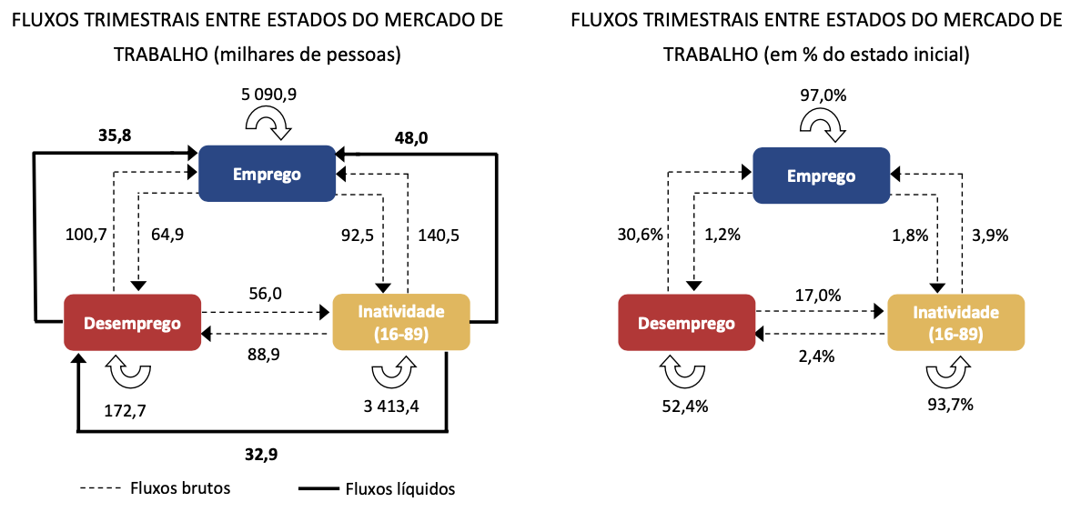 Consequentemente, o fluxo líquido do emprego (total de entradas menos o total de saídas) foi de sinal positivo, com o gabinete estatístico a estimá-lo em 83,8 mil pessoas.