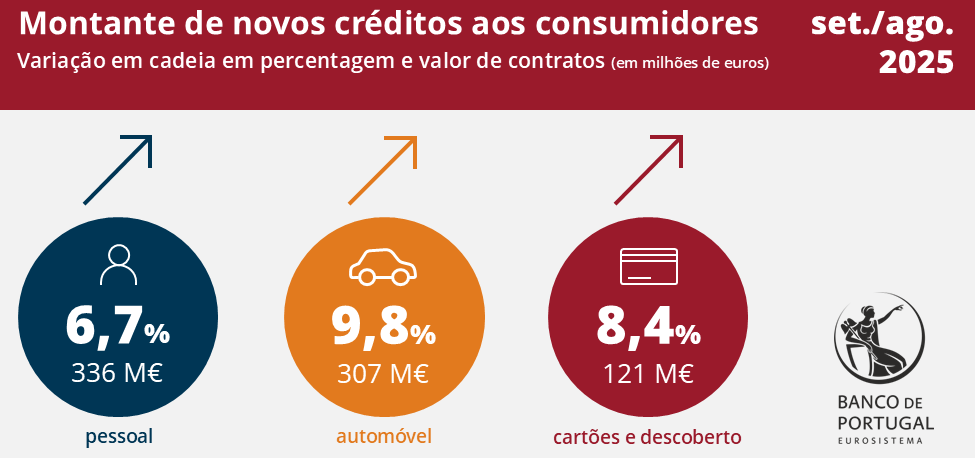 Os portugueses estão a pedir mais dinheiro emprestado. Os novos créditos aos consumidores registaram em setembro um crescimento homólogo de 9,9%, segundo dados divulgados esta segunda-feira pelo Banco de Portugal. Uma evolução que espelha uma confiança renovada das famílias na sua capacidade de endividamento, num contexto de descida das taxas de juro e de recuperação económica sustentada pelo consumo privado.