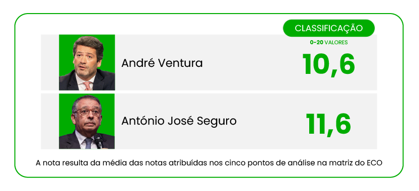 A frase do debate foi de António José Seguro: “Tenho de me resguardar, dentro de quatro meses estarei a recebê-lo em Belém” como líder do Chega. Sem sair da sua habitual contenção, e sem propriamente entusiasmar, surpreendeu também quando entregou uma proposta de pacto “ao líder do Chega”. E repetiu várias vezes que Ventura estava na eleição errada.