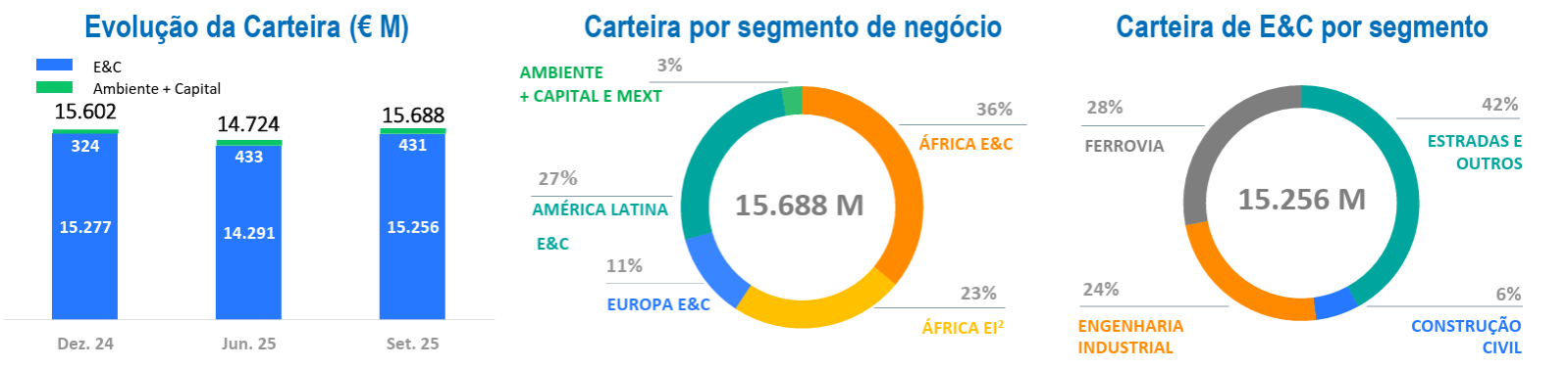 À semelhança do que tem acontecido nas últimas apresentações de resultados, a carteira de encomendas voltou a fixar recordes, atingindo 15,7 mil milhões de euros. São mais mil milhões do que no final de junho, com Angola (19%), México (17%), Portugal (12%) e Nigéria (11%) como os mercados com maior volume de projetos de engenharia e construção.