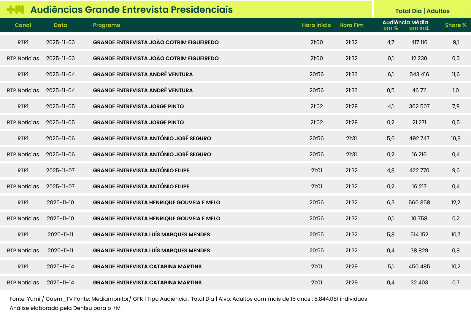 De acordo com a análise da Dentsu para o +M, o líder do Chega foi o que mais se destacou ao conseguir mais de 590 mil pessoas a assistirem à sua entrevista, seguido de perto pelo independente Gouveia e Melo cuja entrevista foi seguida por mais de 571 mil pessoas. Em terceiro lugar surge então Marques Mendes, candidato apoiado pelo PSD, que teve muito perto de 553 mil pessoas a assistirem à sua entrevista.