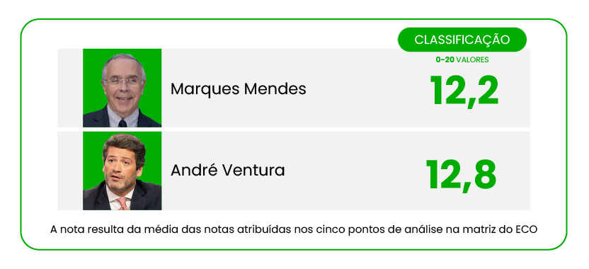 Vitória à tangente de André Ventura, que jogou ao ataque em temas nos quais dribla bem, face a um Marques Mendes que não foi goleado, mas também não conseguiu criar muito perigo.