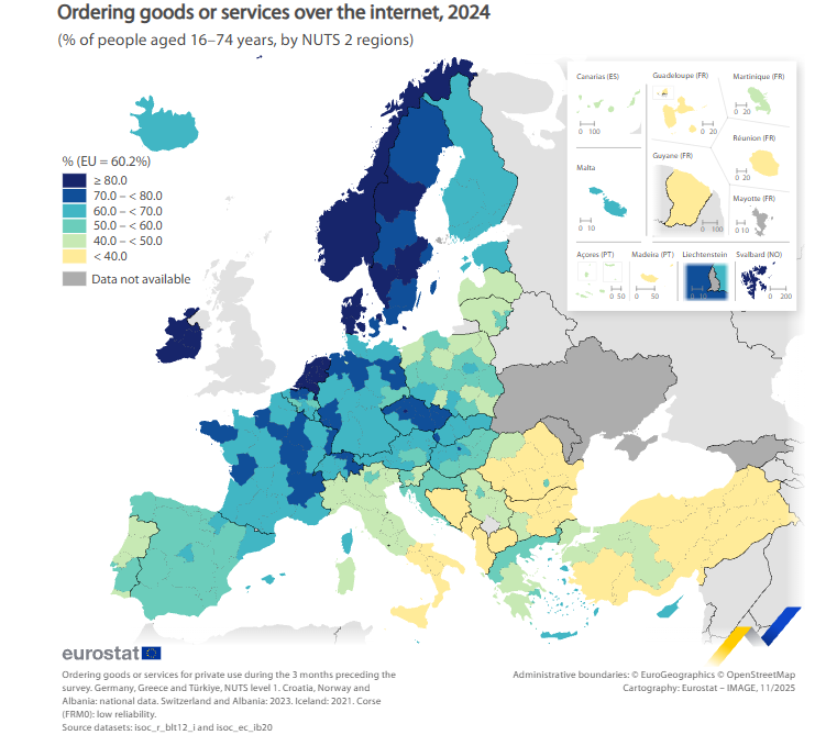 Em 2024, 23 regiões da União Europeia registaram pelo menos 80 % da população entre 16 e 74 anos a encomendar bens ou serviços online. Cerca de metade dessas regiões situa-se na Holanda, com as 12 regiões holandesas no topo, seguidas de quatro regiões da Dinamarca, três da Irlanda, três da Suécia e ainda a capital checa, Praga. A região central de Utrecht, nos Países Baixos, teve a maior percentagem de compradores online, com 91,5 %, seguida da vizinha Flevoland (89,5%).