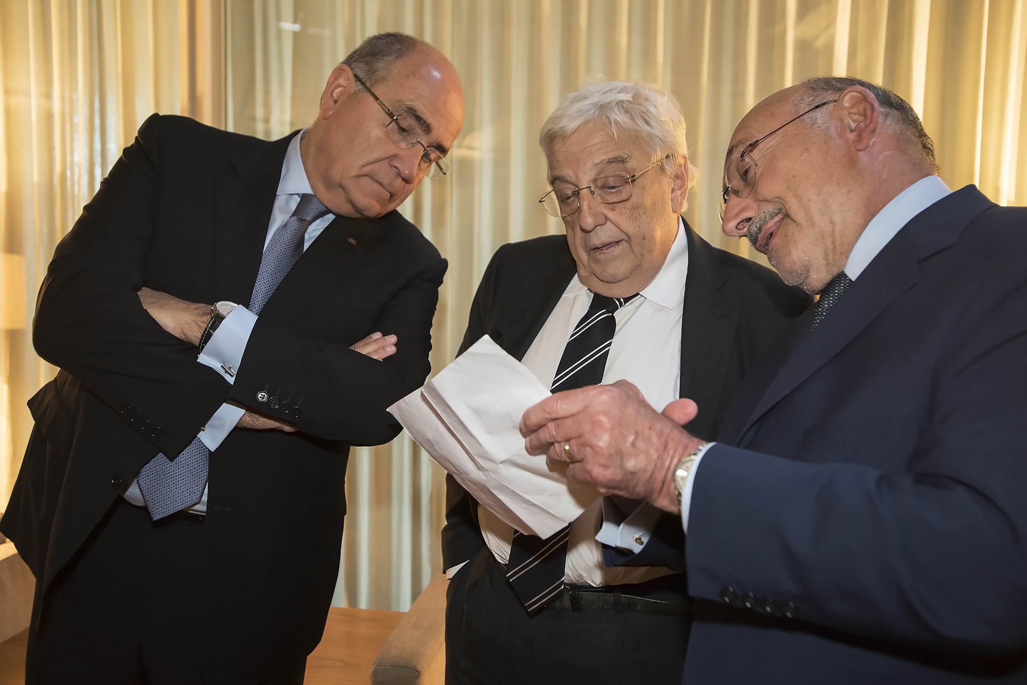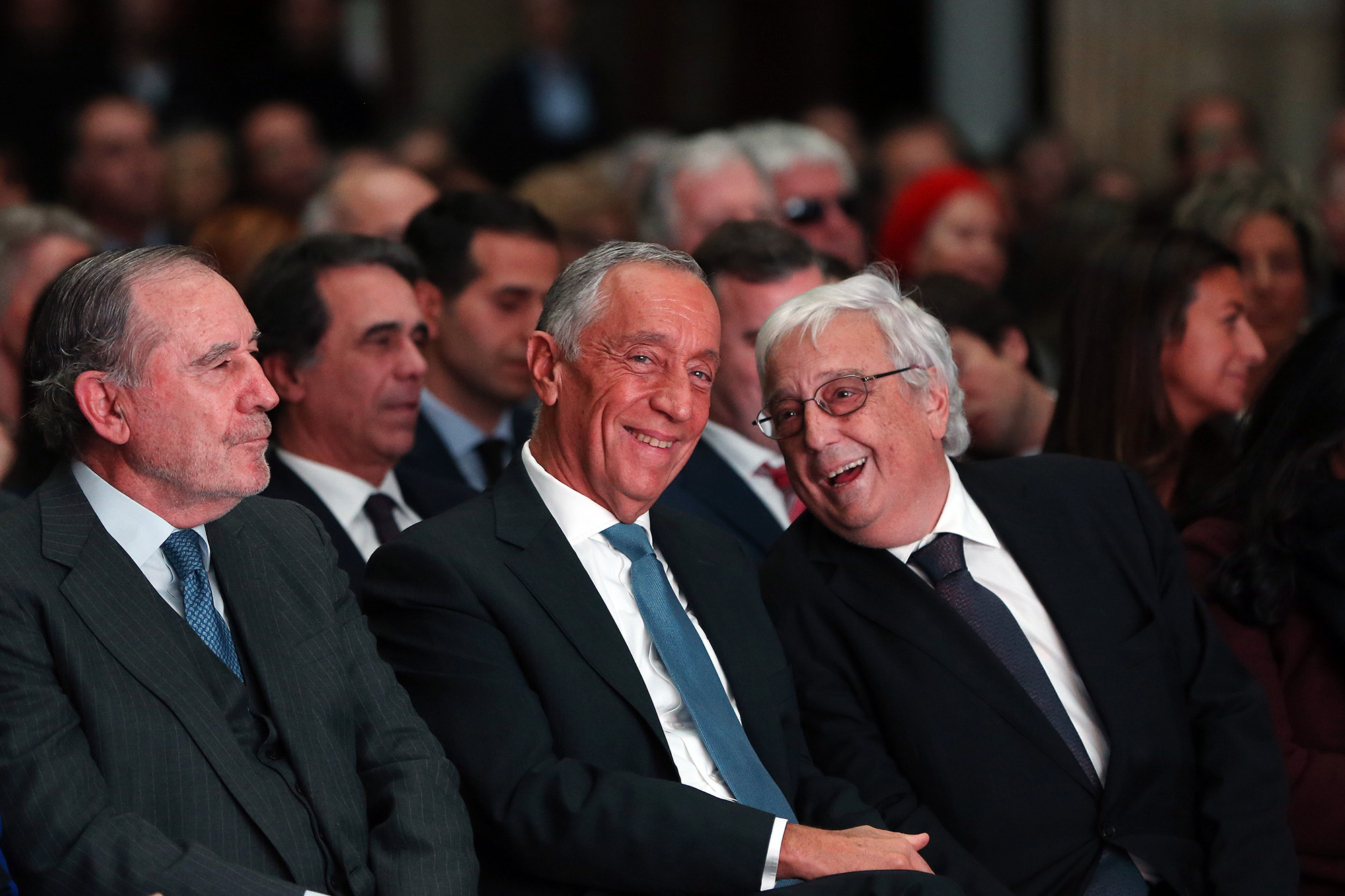 O Presidente da República, Marcelo Rebelo de Sousa (C), acompanhado pelo antigo Presidente da República, António Ramalho Eanes (E), e pelo presidente do Conselho de Administração da Mota-Engil SGPS, António Mota (D), participa no encerramento da 7.ª edição do Prémio Manuel António da Mota, no Palácio da Bolsa, no Porto, 27 de novembro de 2016. JOSÉ COELHO/LUSA -