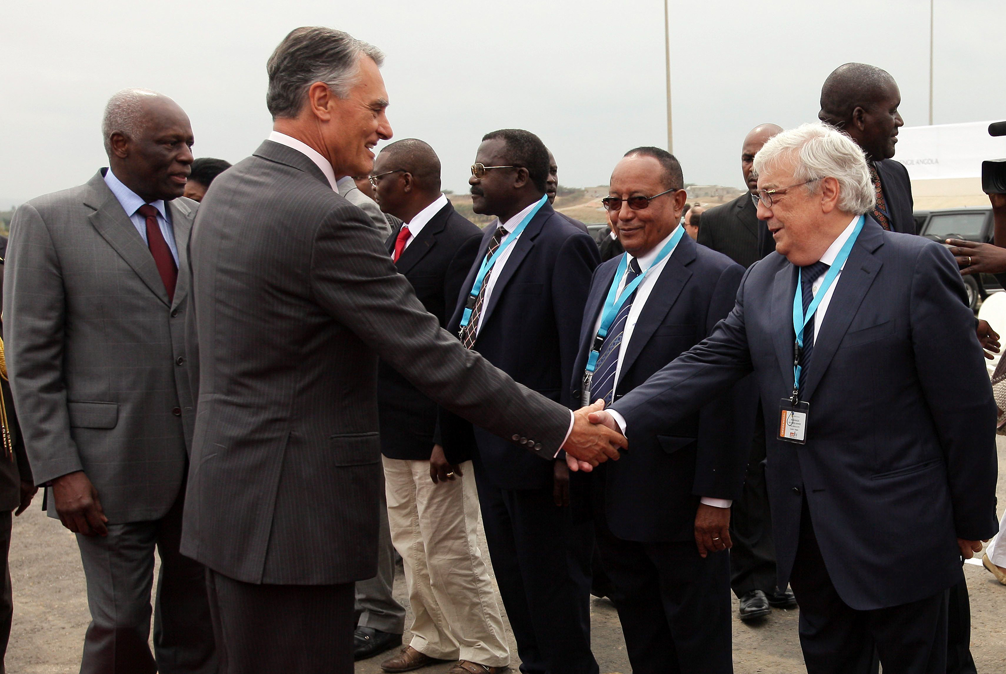 Cavaco Silva acompanhado pelo seu homologo angolano, José Eduardo dos Santos (E), cumprimenta o presidente da Mota-Engil, António Mota, durante a cerimónia de inauguração da unidade fabril NOVICER MIGUEL A. LOPES/LUSA -