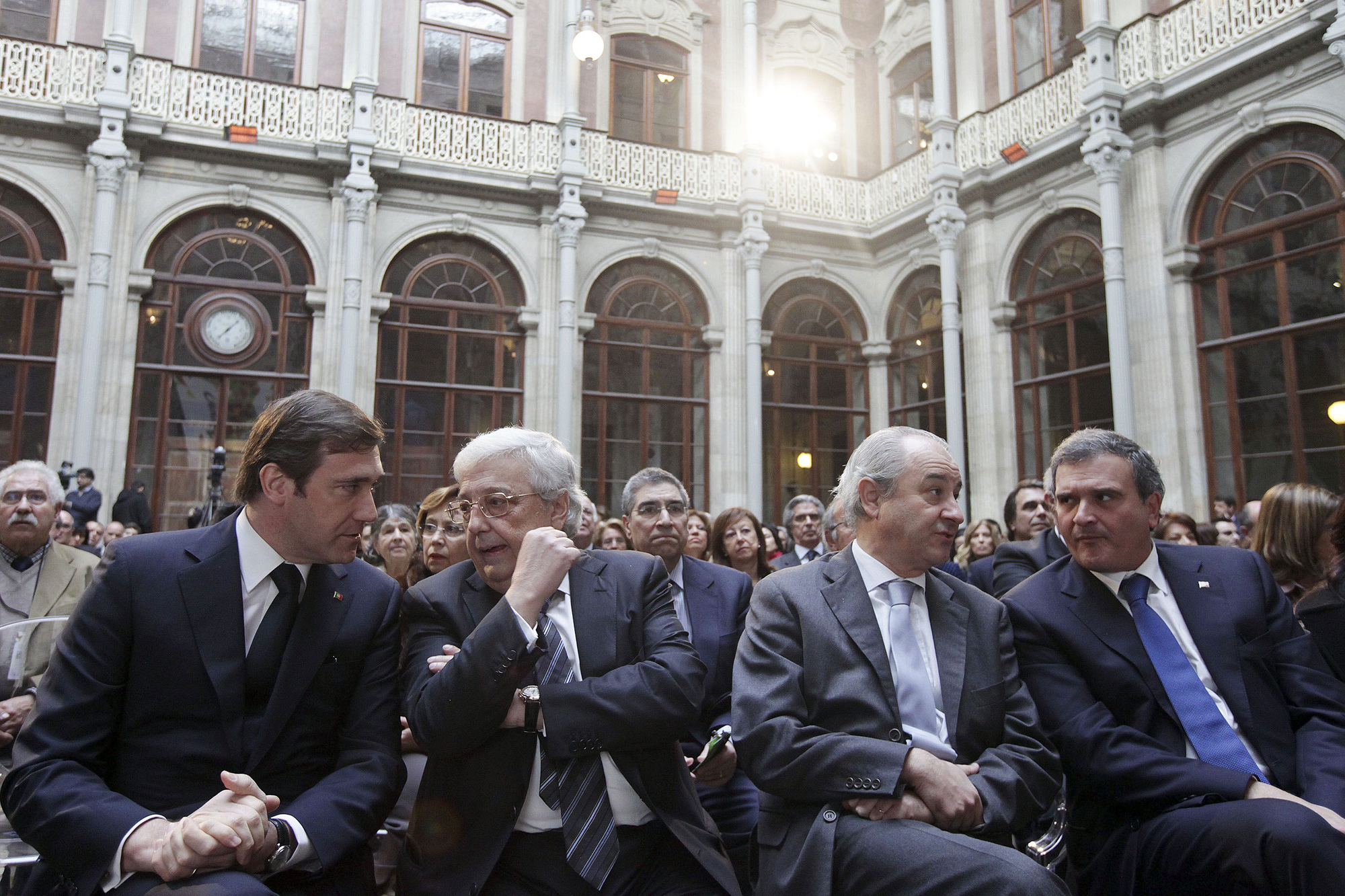 O primeiro-ministro, Pedro Passos Coelho (E) acompanhado pelo presidente do Conselho de Administração da Mota-Engil, António Mota (2E), pelo presidente da câmara do Porto, Rui Rio (2D) e o ministro adjunto e dos Assuntos Parlamentares, Miguel Relvas (D) durante a conferência da entrega do Prémio Manuel António da Mota, no Palácio da Bolsa no Porto, 04 de dezembro 2011. JOSE COELHO/LUSA -