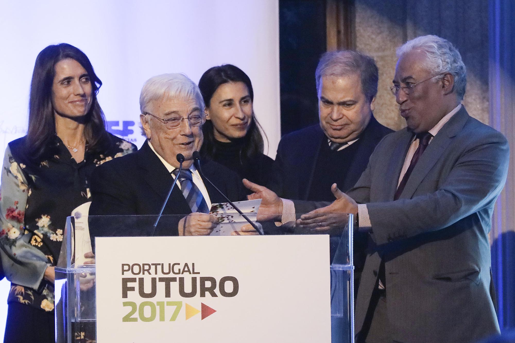 O primeiro-ministro, António Costa (D), acompanhado pelo presidente do Conselho de Administração da Mota-Engil SGPS, António Mota (2E), durante a sessão de encerramento da cerimónia Portugal Futuro 2017, organizada pela Fundação Manuel António da Mota, TSF e Mota-Engil, realizada no Palácio da Bolsa, no Porto, 03 de dezembro de 2017. MANUEL ARAÚJO/LUSA -