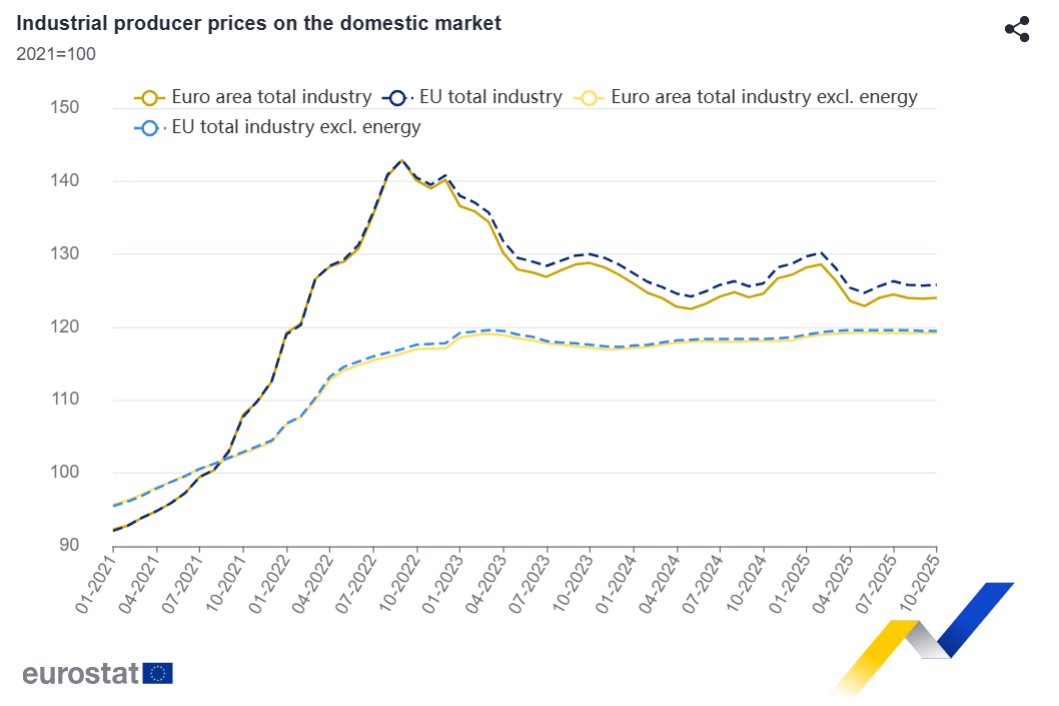 Na totalidade da União Europeia, os preços da produção industrial subiram 0,2%. As maiores quedas anuais foram registadas no Luxemburgo (-5,6%), Irlanda (-3,6%), Áustria (-2,6%) e Portugal (-2,5%), enquanto os maiores aumentos foram observados na Bulgária (+17,6%), Roménia (+9,4%) e Suécia (+4,9%).