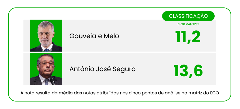 Após uma troca (com pouca coisa de interesse) sobre a Justiça, a discussão terminou com o tema da Defesa. É território confortável para o almirante, mas não conseguiu (ou não quis) ‘desqualificar’ Seguro no assunto, destacando apenas que para ser Presidente, ajuda ter maior domínio das matérias militares. A diferença entre os dois candidatos acabou por ser a postura que Portugal deve ter no mundo: para Seguro mais europeísta, especialmente dado quem está na Casa Branca, e para Gouveia e Melo, foco na Europa “sem desenlaçar o Atlântico”. Um final interessante, mas a vitória já tinha sido garantida por Seguro nos primeiros momentos ao ataque.