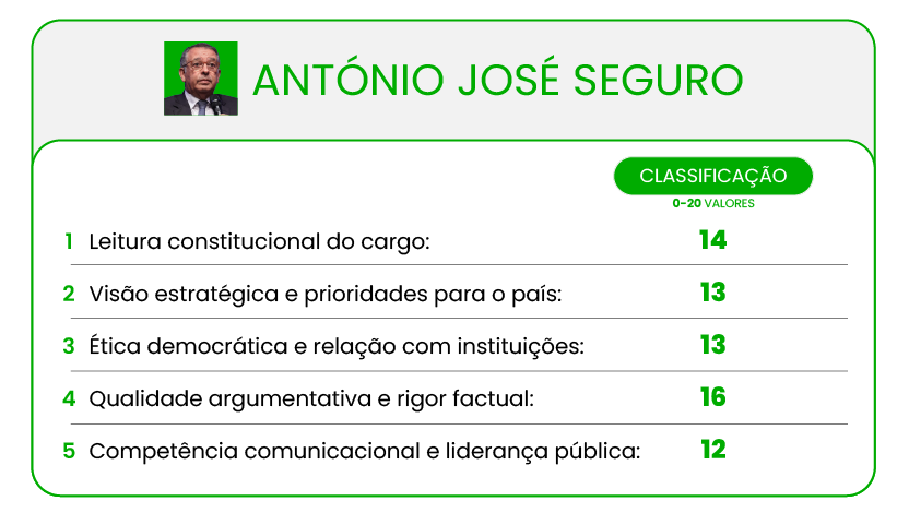 Seguro começou por bater na tecla já comum nestes debates contra o almirante, dizendo que o País “precisa de Presidente com experiência política, que não venha ao improviso e a aprender no cargo”. Gouveia e Melo acusou o ex-líder socialista de ser inseguro, citando até para o propósito Mário Soares, e a apontar para os 11 anos de Seguro fora da vida política, um período no qual no país aconteceram coisas graves (como os incêndios de Pedrógão Grande e a pandemia) e na qual ele próprio esteve presente. “É um candidato nem-nem”, concluiu.