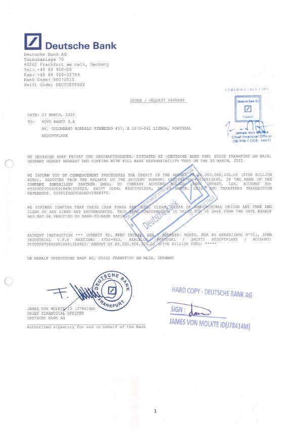 O documento — que junta ainda uma aprovação do Bundesbank para a transferência dos fundos para Portugal assinada por um responsável chamado Gunter M. Dunkel — será um entre vários através dos quais a FNBC procura provar que a sociedade Immobilien Partner GMBH transferiu 5 mil milhões de euros no dia 23 de março de 2022 para uma conta da empresa no Novobanco.