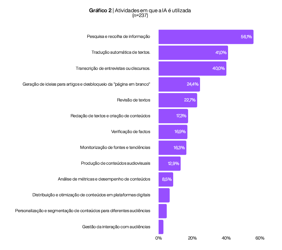 A utilização de IA nas redações portuguesas é tendencialmente mais operacional, sendo aplicada maioritariamente na pesquisa e recolha de informação (56,1%), com a tradução automática de textos (41%) e a transcrição (40%) a ocuparem ainda um lugar de relevância.
