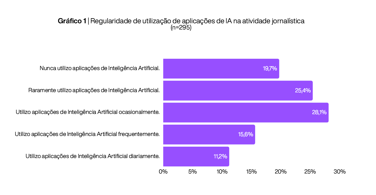 A falta de formação específica não tem impedido a utilização de aplicações de IA na atividade jornalística, com apenas 19,7% dos jornalistas inquiridos a dizer que nunca utiliza. O padrão de uso é predominantemente ocasional (28,1%) ou raro (25,4%), com apenas uma minoria a reportar uso diário (11,2%). É no jornalismo online que a IA é mais utilizada, com 57,6% a reportar um uso diário. Em contraste está a televisão, com 18% a indicar nunca usarem.