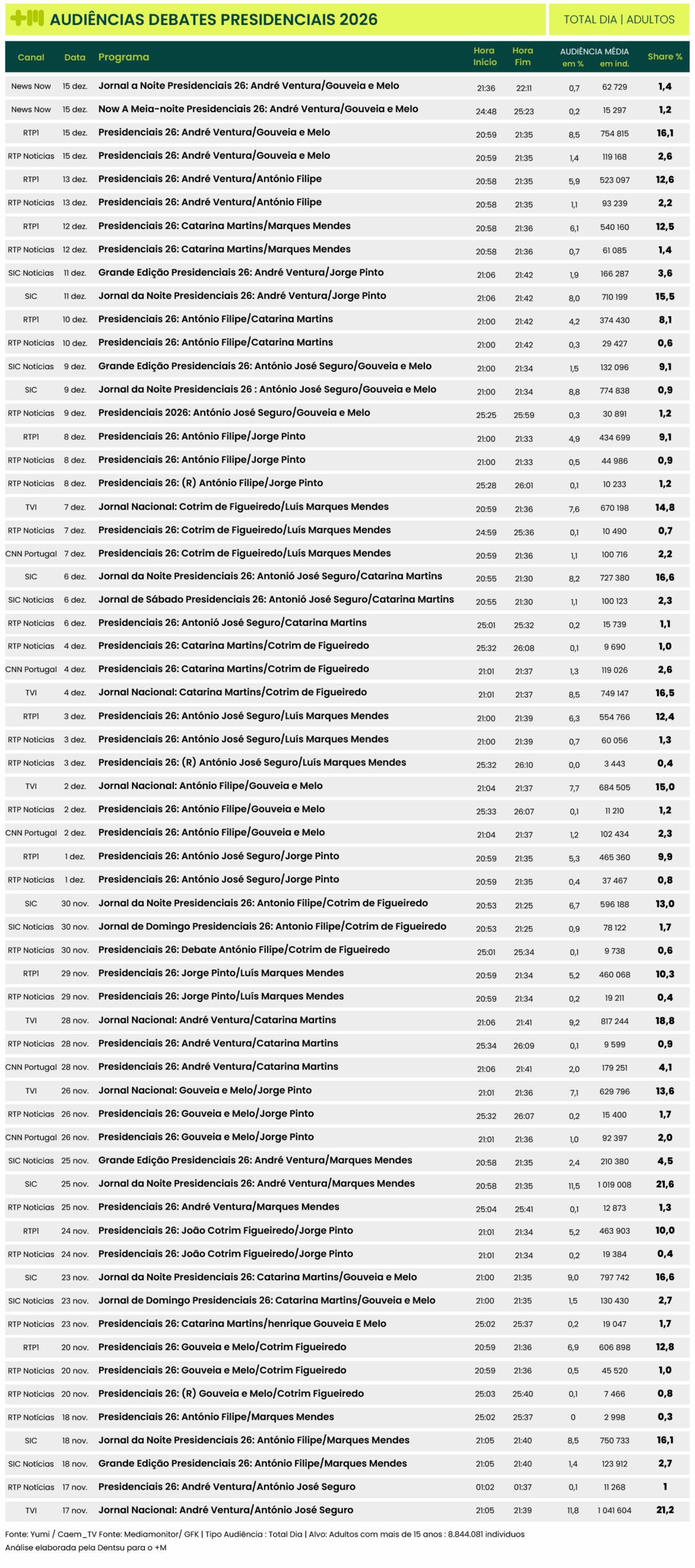 Este é o debate mais visto de Henrique Gouveia e Melo. Já o confronto mais visto de André Ventura continua a ser aquele que o opôs a Luís Marques Mendes em 25 de novembro, com 1.242.261 telespectadores. Continua a ser o debate mais visto até ao momento.