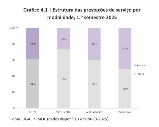“No primeiro semestre de 2025, os contratos de prestações de serviços foram celebrados maioritariamente (61,1%) na modalidade de tarefa. Esta modalidade predominou nas entidades da administração central e administração regional da Madeira, enquanto nas entidades da administração local foi maior o número de prestadores de serviços com contratos de avença (51,0% do total)”, de acordo com o mesmo relatório.