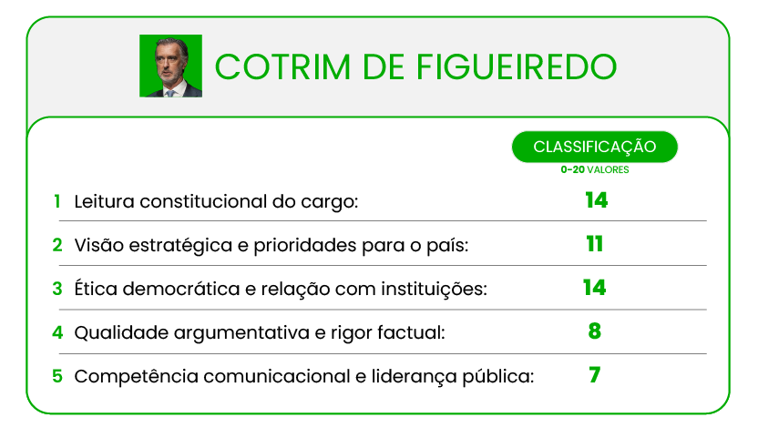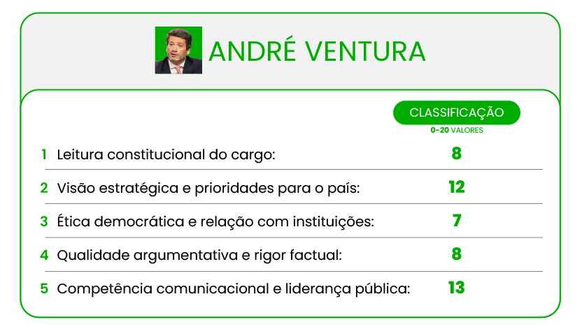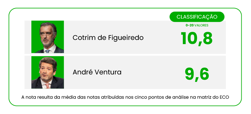 Em suma, Cotrim de Figueiredo venceu no conteúdo “sério” mas não foi eficaz nas explicações na comunicação, parecendo algo em baixo de forma; Ventura foi igual a si próprio, eficaz no seu estilo mas recorrendo aos argumentos simplistas de sempre, com pouca ligação a soluções concretas ou às funções de Chefe de Estado.