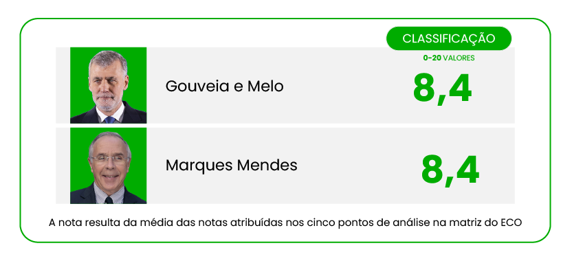 A resposta à primeira pergunta, acerca da informação de clientes divulgada por Marques Mendes, consumiu quase metade do debate, dando a Gouveia e Melo a oportunidade de ser absolutamente direto na estratégia que trazia para esta noite: colar o seu adversário aos ricos e poderosos e aos grandes interesses não divulgados, o que alegadamente diminui a sua independência para ser Presidente da República.