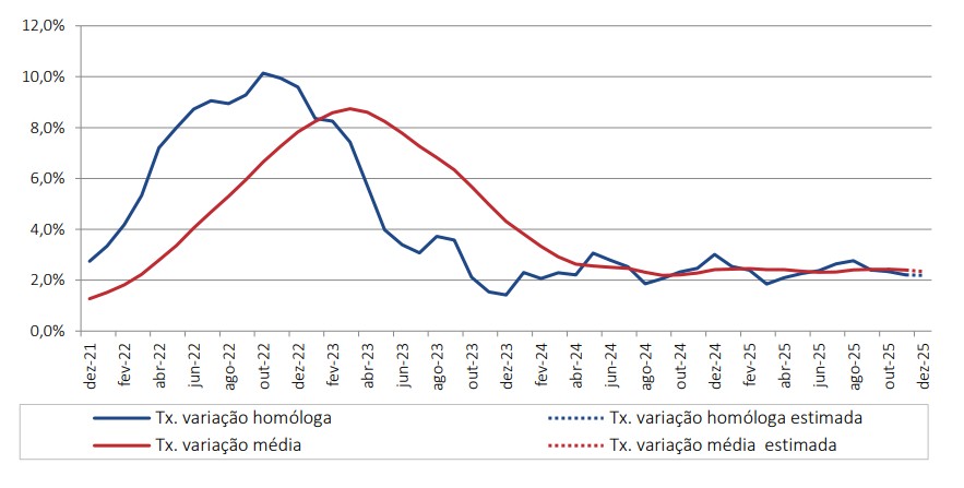 A estimativa anual fica acima da mais recente do Banco de Portugal, que aponta para um recuo da inflação para 2,2% em 2025. É precisamente a mesma taxa prevista pelo Fundo Monetário Internacional (FMI) no World Economic Outlook. Já o Governo projetou, no Orçamento do Estado para 2026, que, no conjunto deste ano, a inflação – medida pelo Índice Harmonizado de Preços no Consumidor – se situasse nos 2,4%.