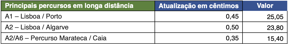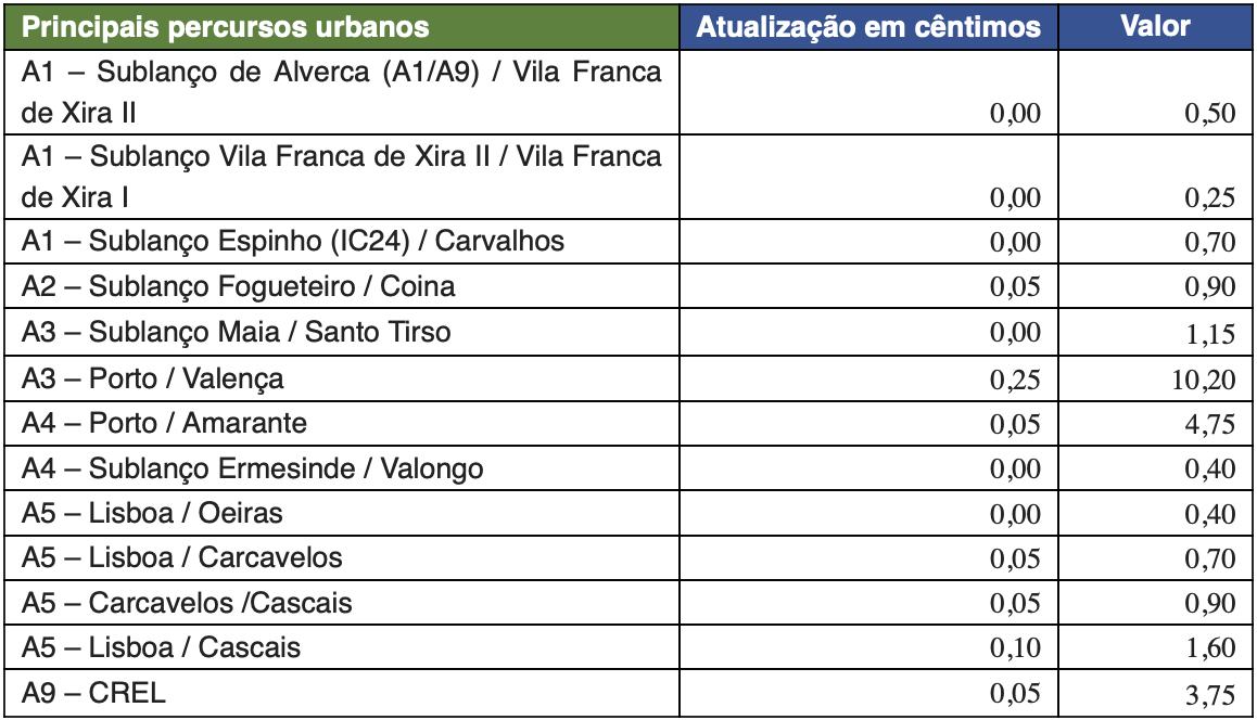 As portagens na A1 entre Lisboa e Porto irão aumentar 45 cêntimos, para 25,05 euros, subindo ainda 50 cêntimos na A2 entre Lisboa e Algarve, para 23,80 euros, a partir de 1 de janeiro, segundo comunicado da Brisa. Também o trajeto A2/A6 – Percurso Marateca / Caia, para veículos de Classe 1, terá um aumento de 35 cêntimos, para 15,40 euros.