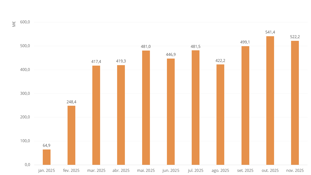 Só em novembro foram celebrados 2,5 mil contratos, num total de 522 milhões, diminuindo cerca de 5% em relação a outubro.