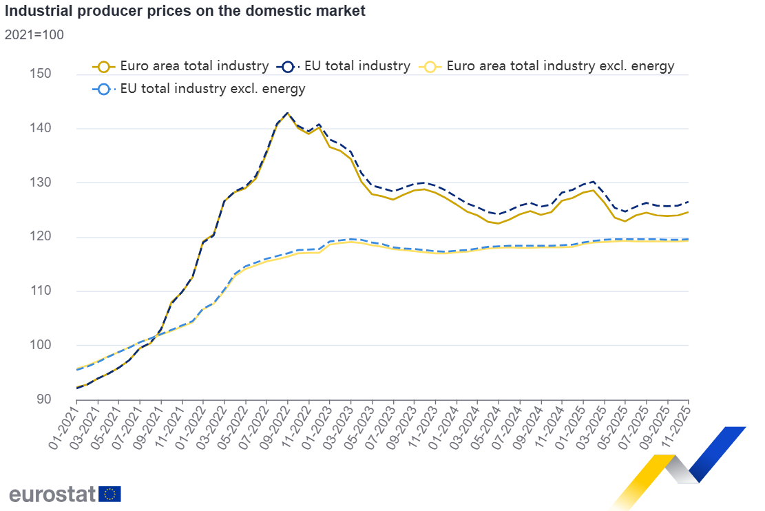 Na zona do euro, em novembro de 2025, em comparação com novembro do ano anterior, os preços aumentaram 0,4% para bens intermediários, 1,8% para bens de capital, 2% para bens de consumo duráveis e 1,1% para bens de consumo não duráveis. Por outro lado, diminuíram 7,4% no setor energético.